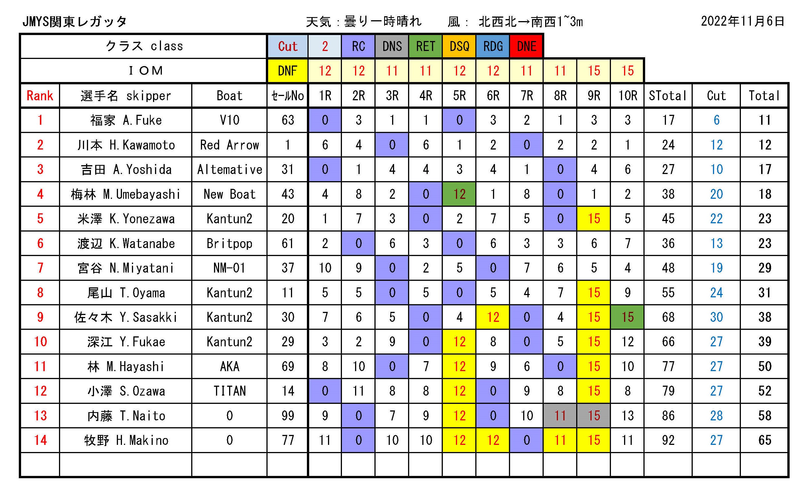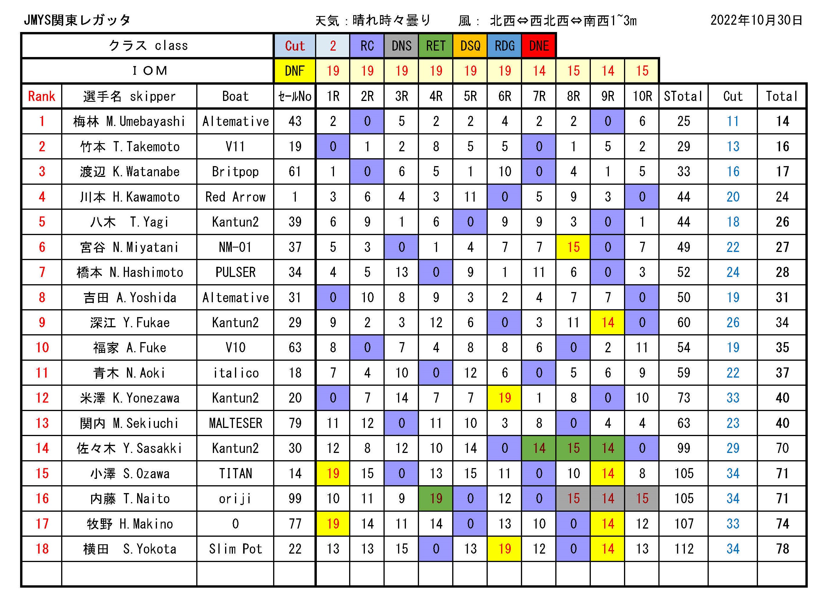 - 10月16日 関東レガッタ レース結果 IOM DF95