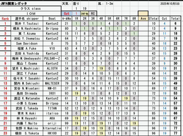 今回のトピックとしては、初優勝を目指すNo.34望月選手を中心に、No.79関内選手、関東支部長No.31吉田選手、そしてIOMチャンピオンのNo.221筒井選手が上位を争う展開。